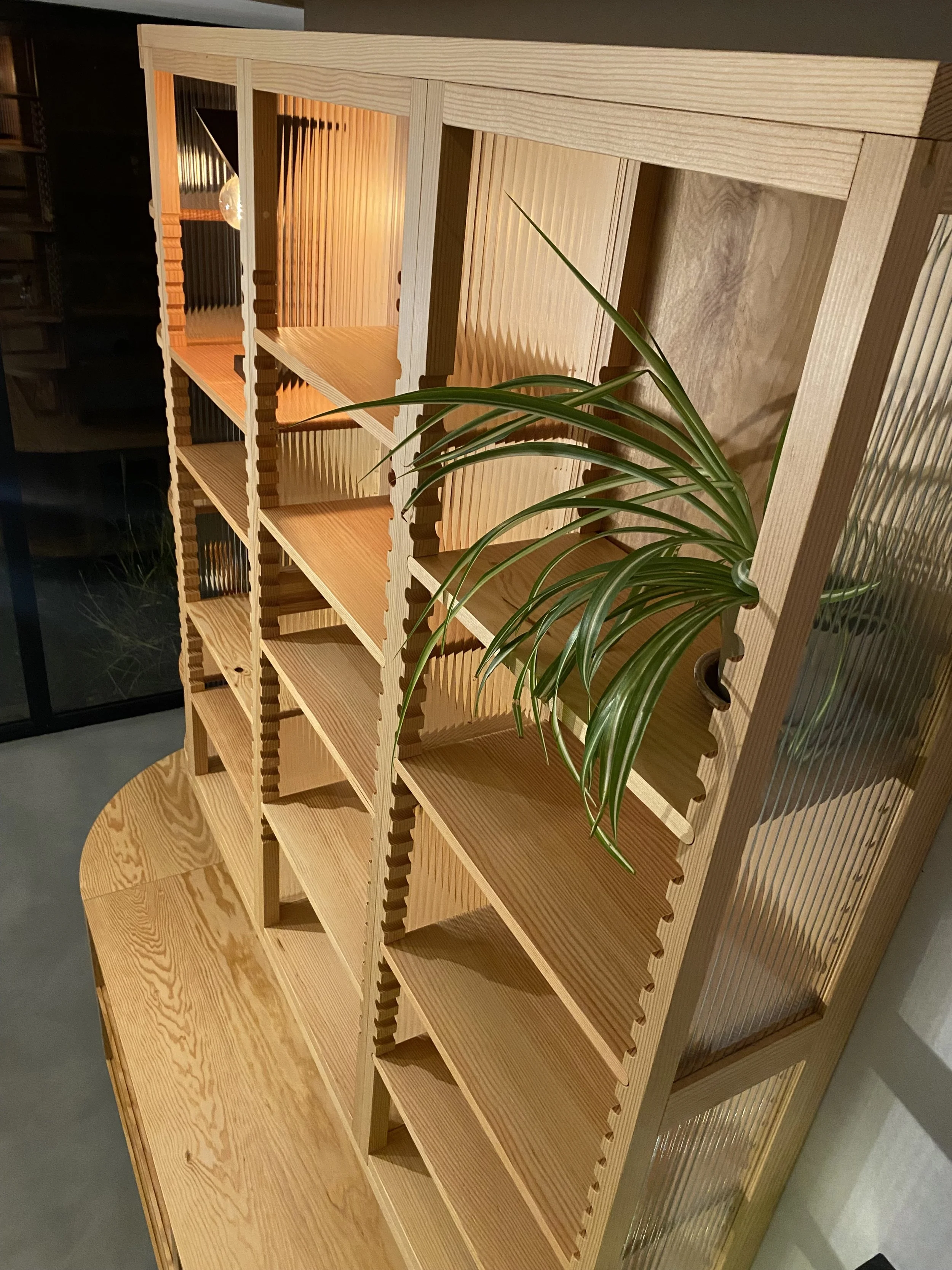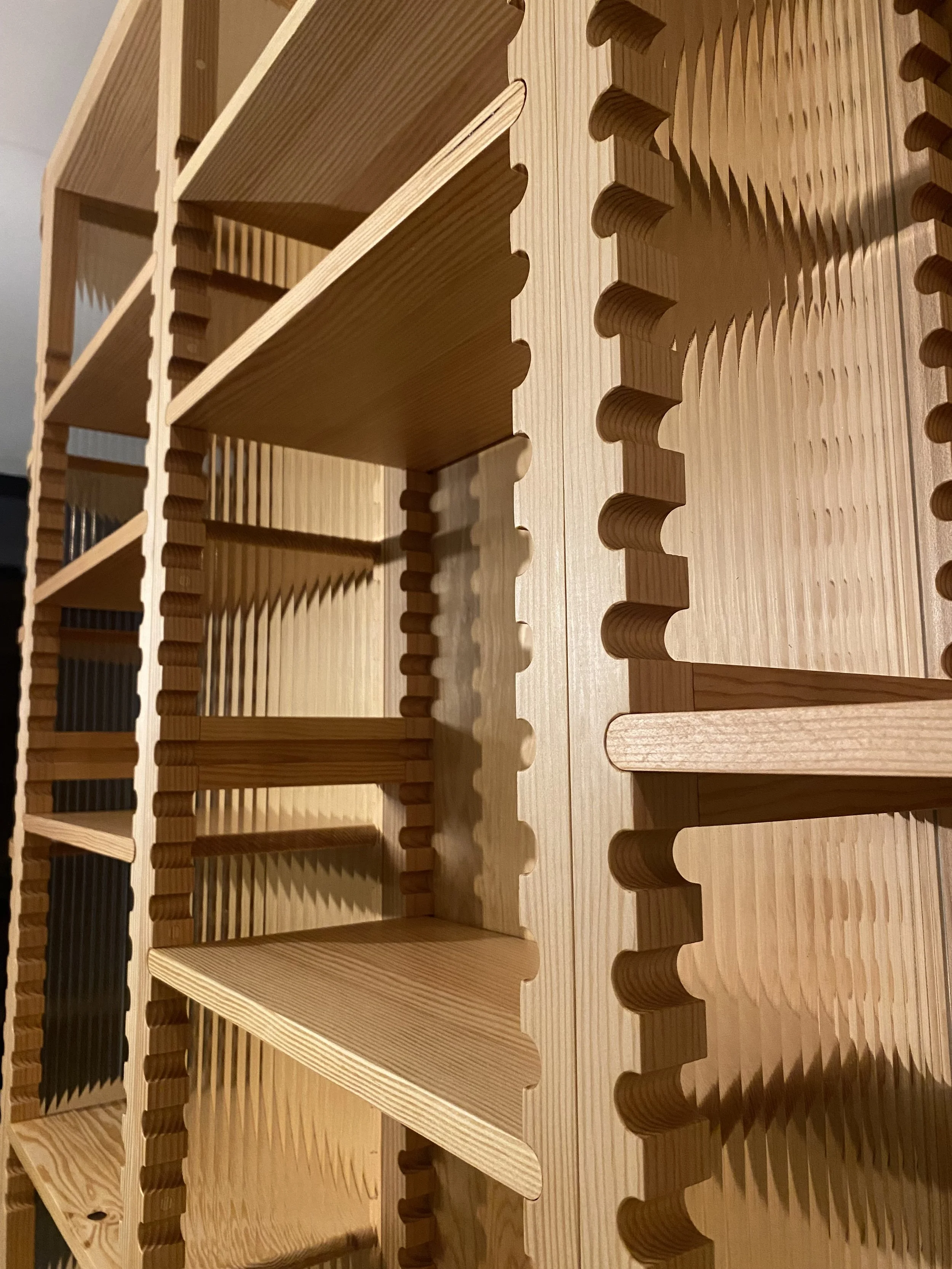 Solid Douglas Fir, fluted glass, and what I ended up calling ‘fishbone’ modular shelving system come together to create something that’s as functional as it is lovely to look at.
