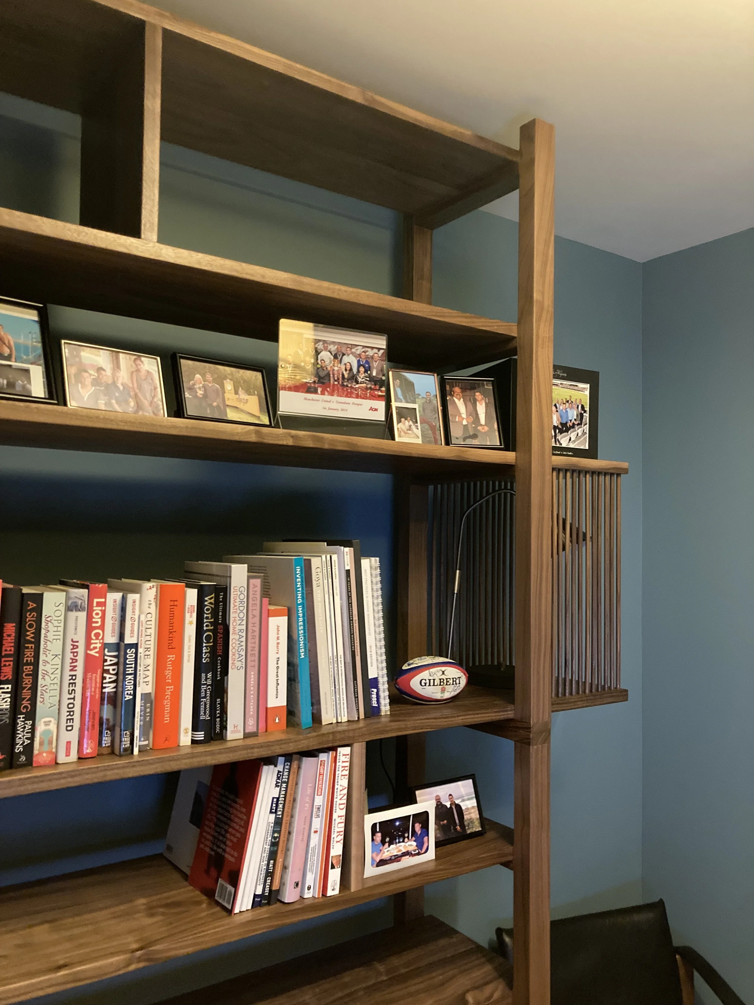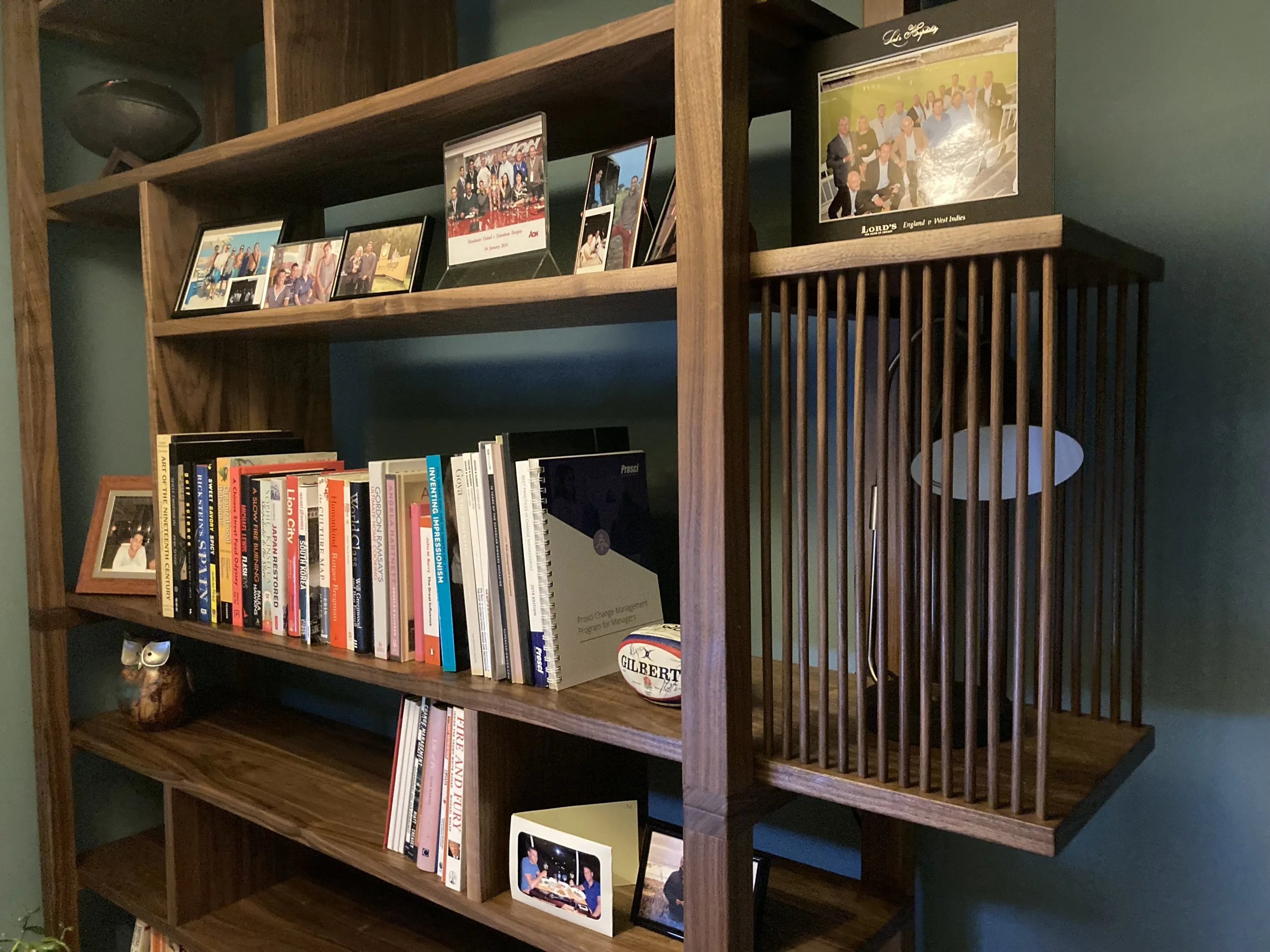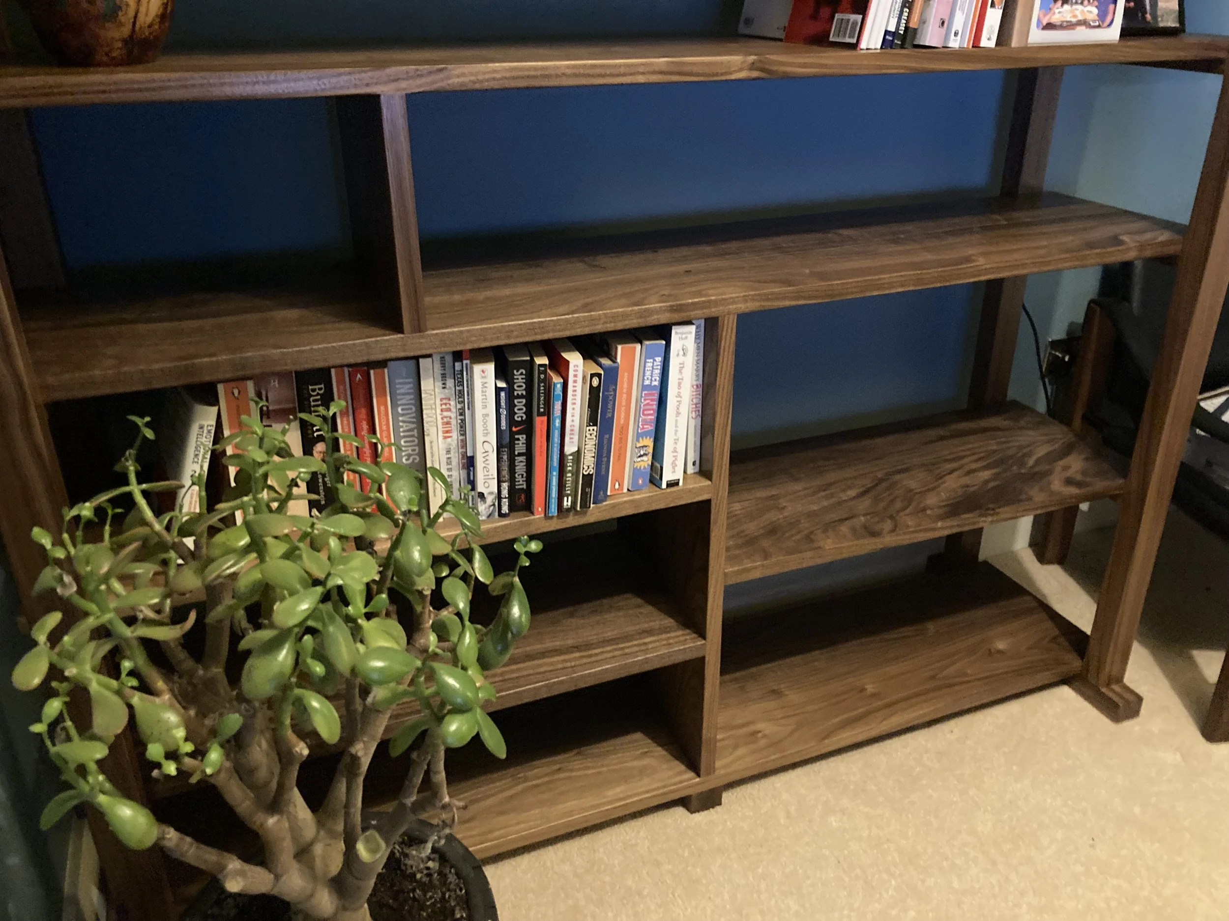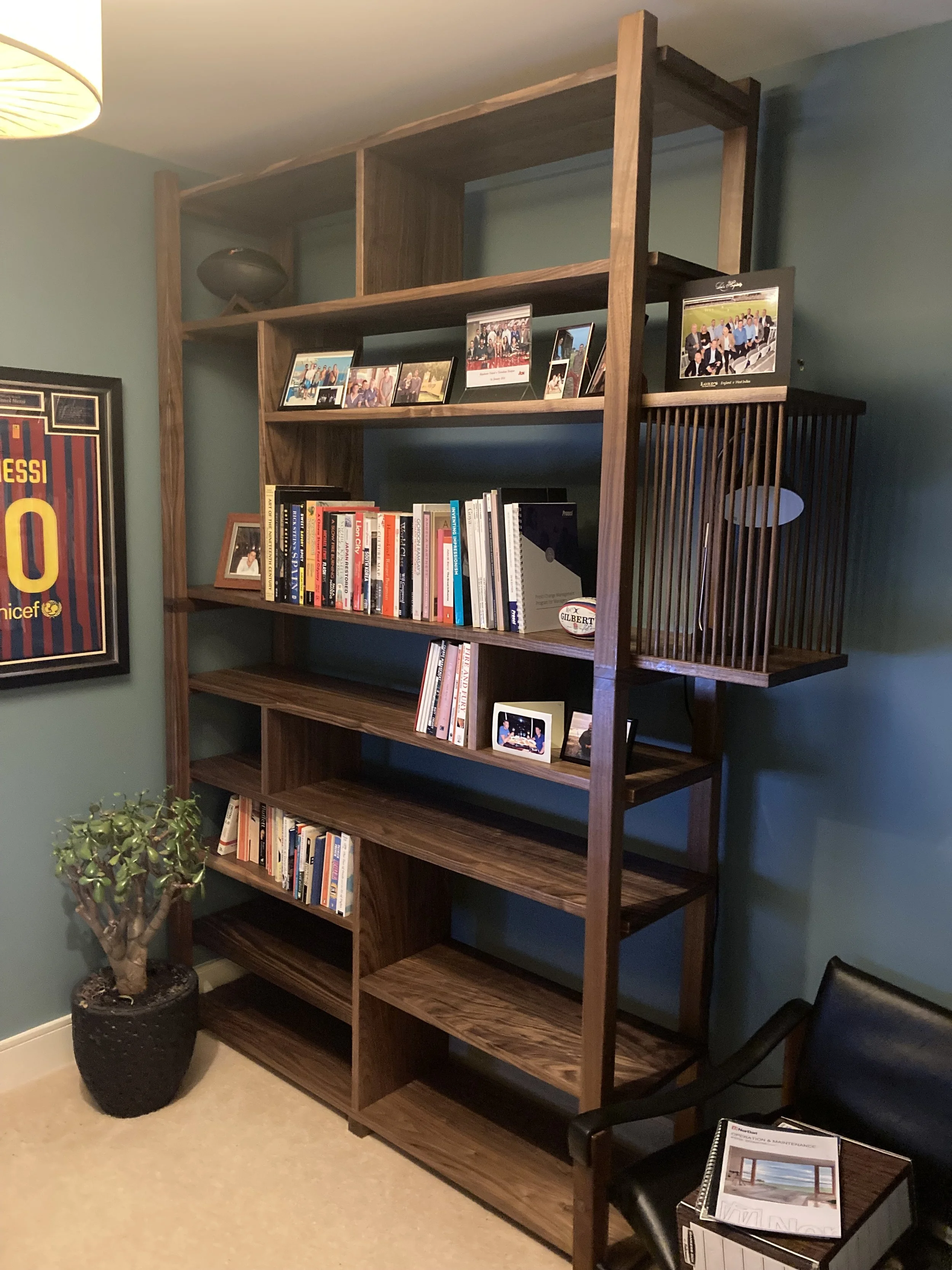 This is a shelving unit made entirely from solid Black Walnut. The client wanted an asymmetrical piece with plenty of areas to store and display items of all shapes and sizes. I had lots of fun planning out the spacing for each section, making sure they would be varied but useful. The design also includes a “bird cage” on one side that acts as a light diffuser. Because of all the different compartments and sizes, I took to calling this unit “The Menagerie Shelves”